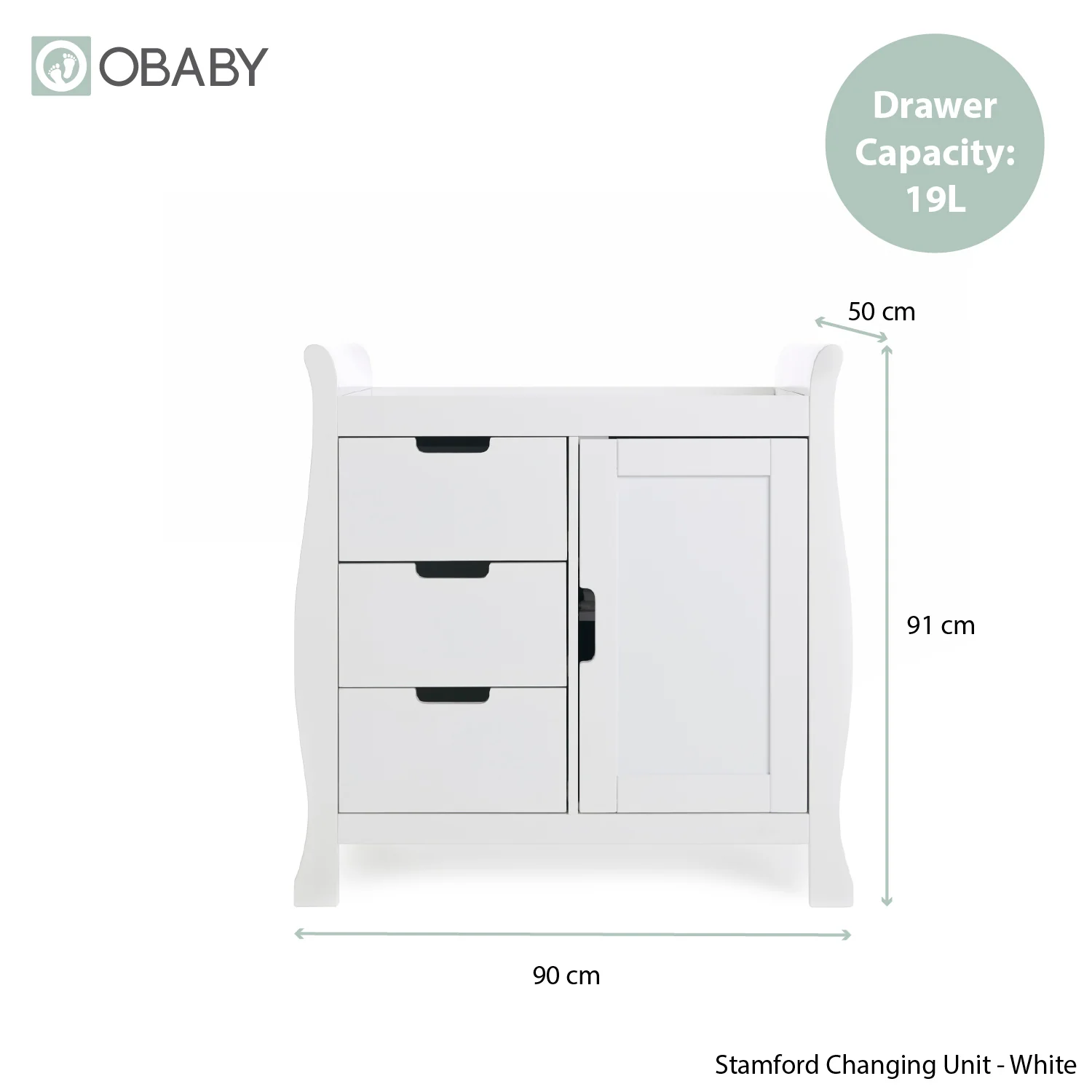 This beautiful closed changing unit features the same elegant sleigh design that flows through the rest of the Stamford collection. Sleek lines and recessed handles create a stylish and uncluttered look, whilst ensuring it is simple to use. Its combination of three spacious 19L capacity drawers and full height cupboard with adjustable shelf and soft close door provide plenty of storage options for little one’s precious belongings, whilst the cleverly recessed section on the top of the changing unit perfectly accommodates a changing mat up to 76 x 46cm.