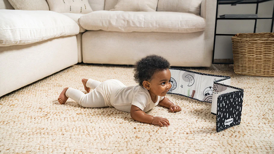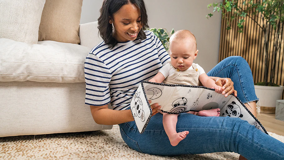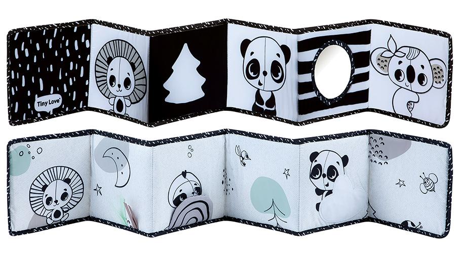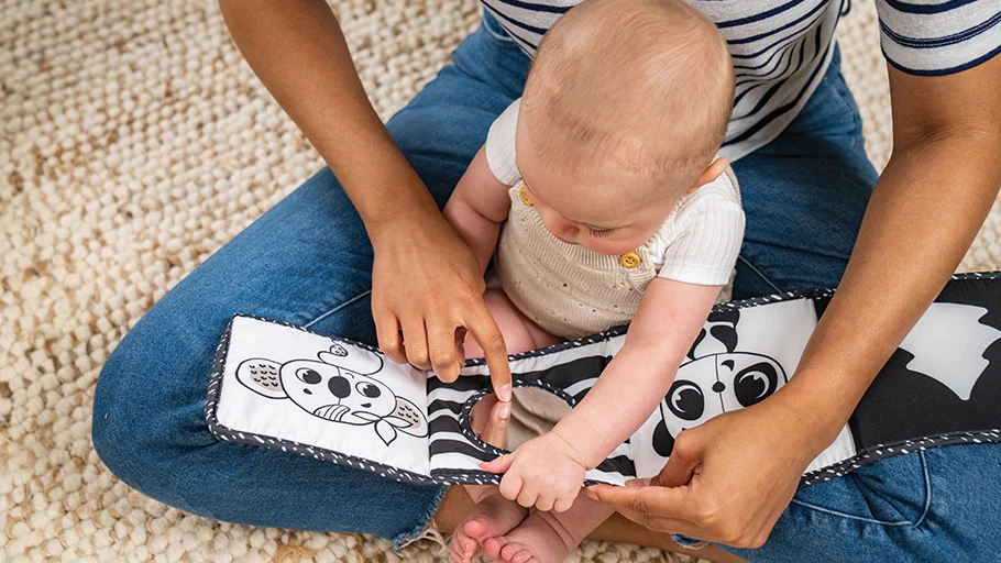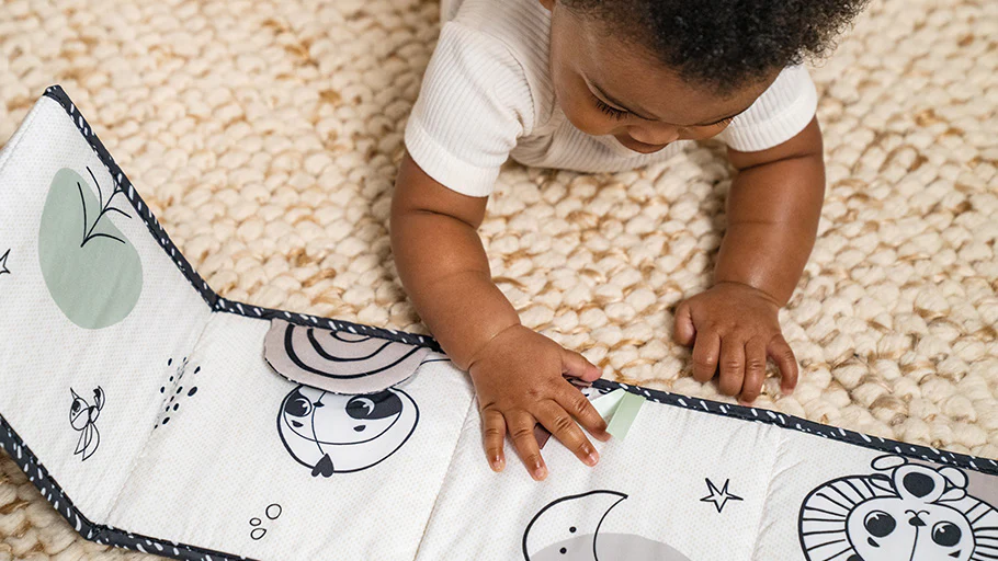 - Engaging dual stage developmental baby book with 7 activities and two sides: one black & white the other colorful.